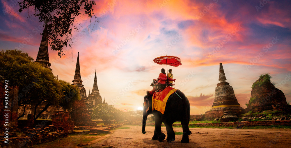 Papier peint The tourists on an ride elephant tour of Ayuthaya the ancient city of Thailand in sunset background