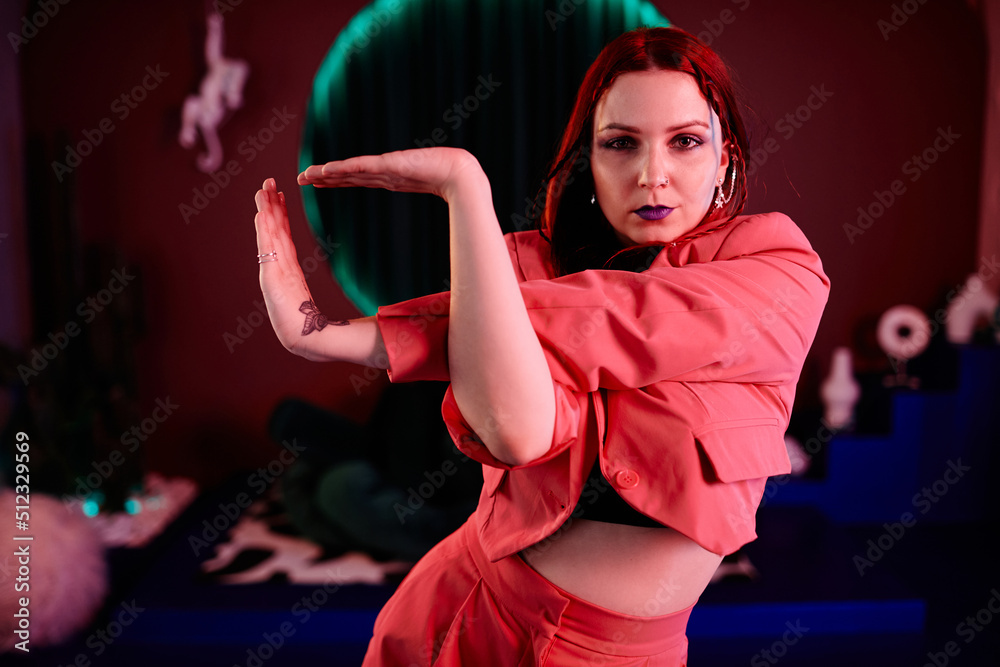 Papier peint Waist up portrait of young woman dancing vogue style in pink neon light with foc