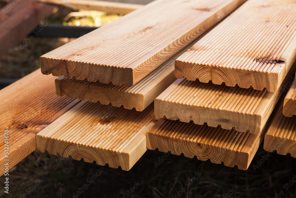 Papier peint Stacked larch deck boards, close up outdoor photo