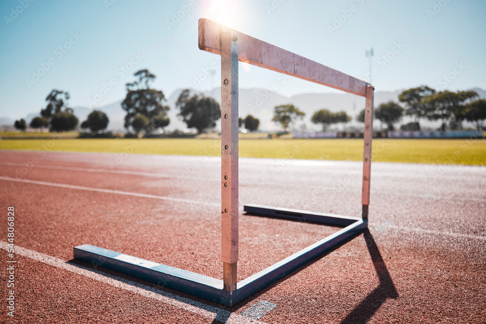 Papier peint Empty stadium, field and running hurdle or barrier at outdoors race track