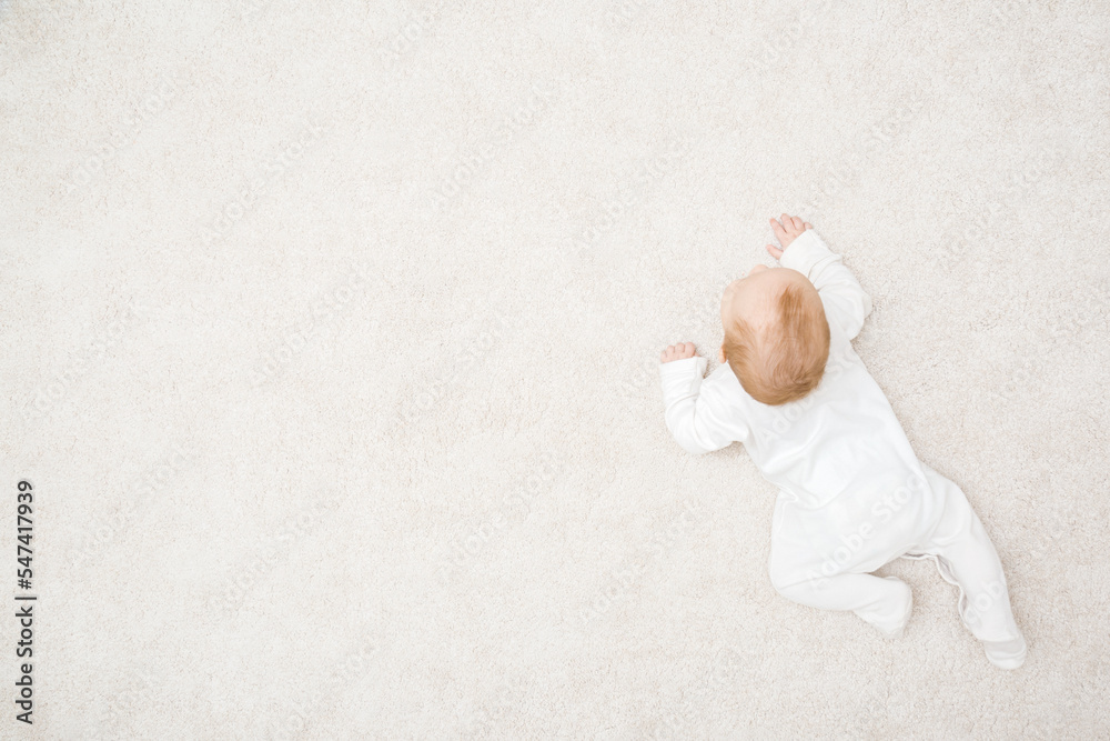 Papier peint Baby in white bodysuit crawling on knee and arms on light beige home carpet background
