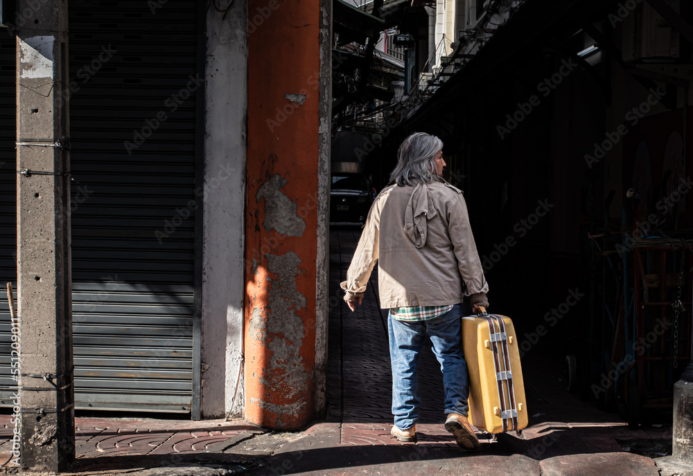 Papier peint Asian homeless man dragging large suitcase in a narrow alley for to find rest, no home live on street, elderly man find new place sleep on sidewalk, health care problems for migrant refugees in slump