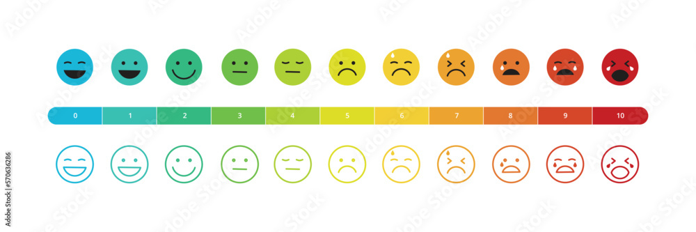 Pain rating scale chart. Flat and line horizontal pain measurement scale. Colorful emotions from happy to crying icon. Vector illustration