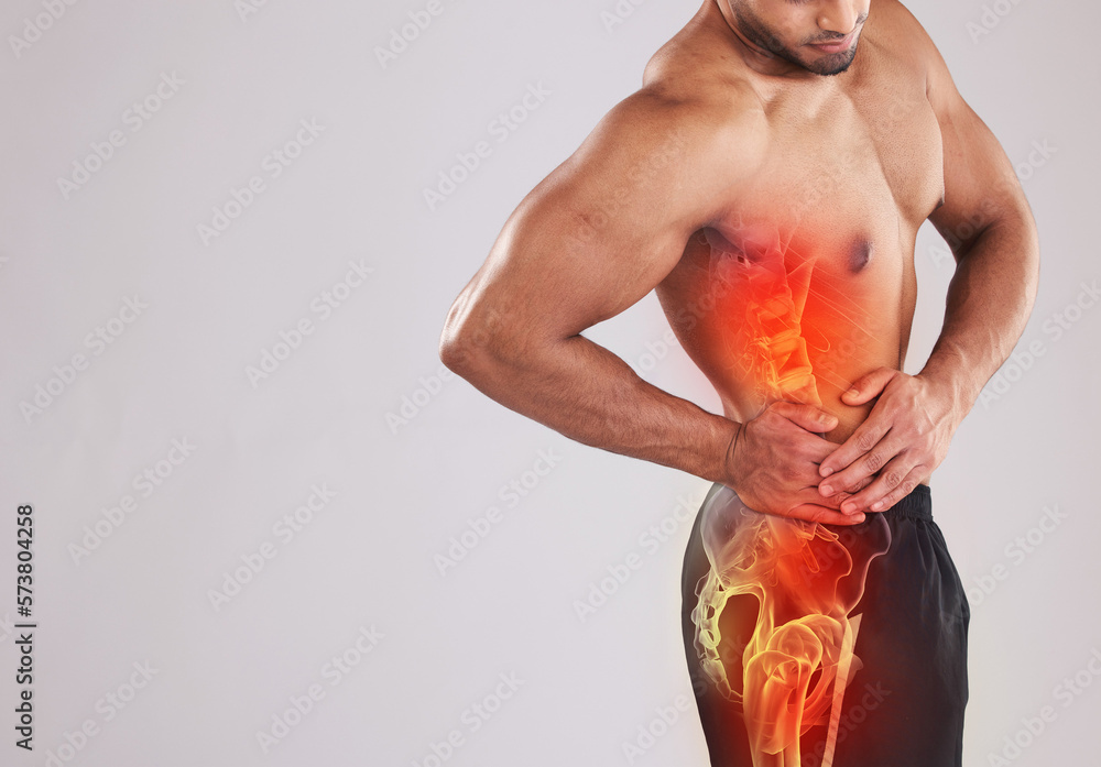 Papier peint Mockup, health and man with pain, side and fitness with muscle tension, inflammation and broken bone on grey studio background
