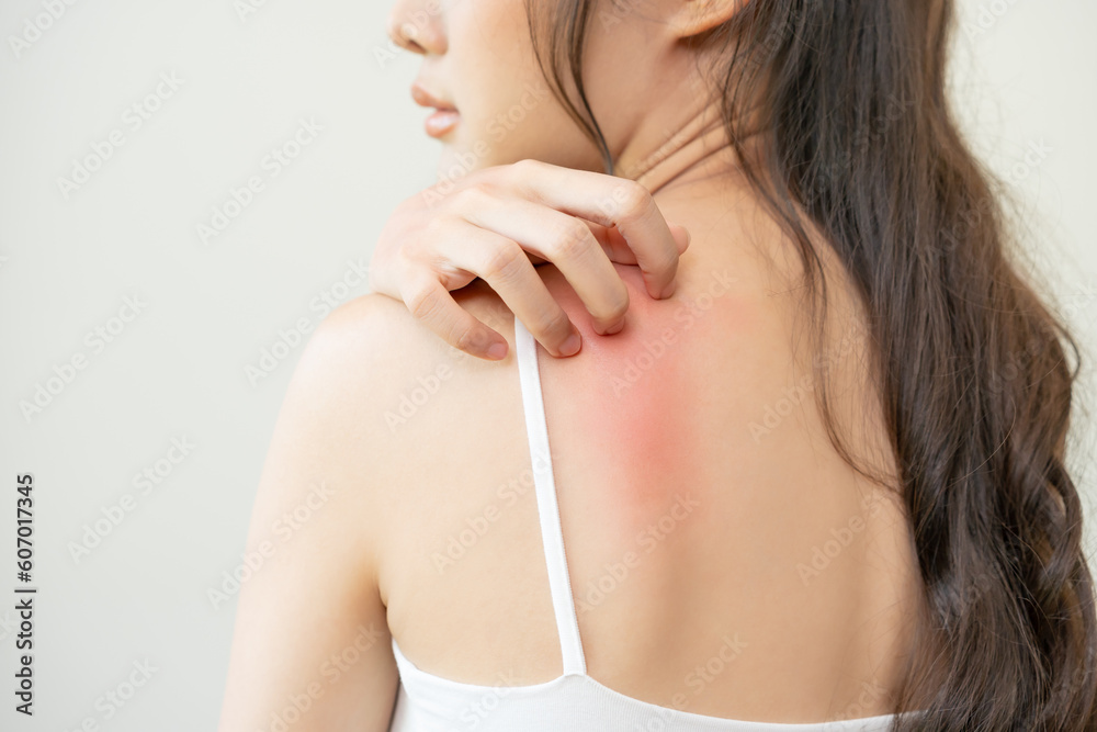 Papier peint Dermatology, asian young woman, girl allergy, allergic reaction from atopic, insect bites on her back, hand in scratching itchy, itch red spot or rash of skin