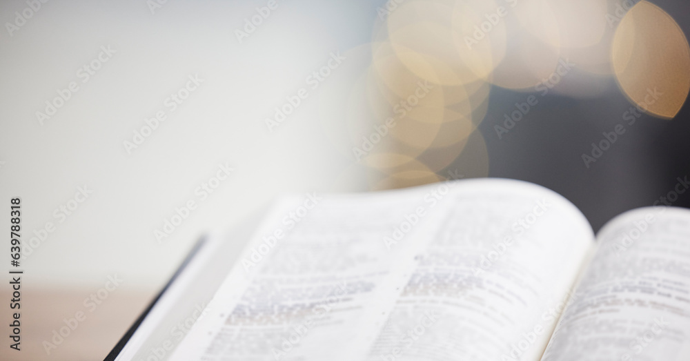 Papier peint Closeup, bible or book for faith, studying religion and mindfulness with holy spiritual scripture