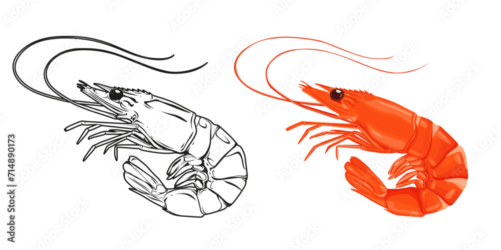 Papier peint Red cooked shrimp and vector hand drawn shrimp isolated on white background
