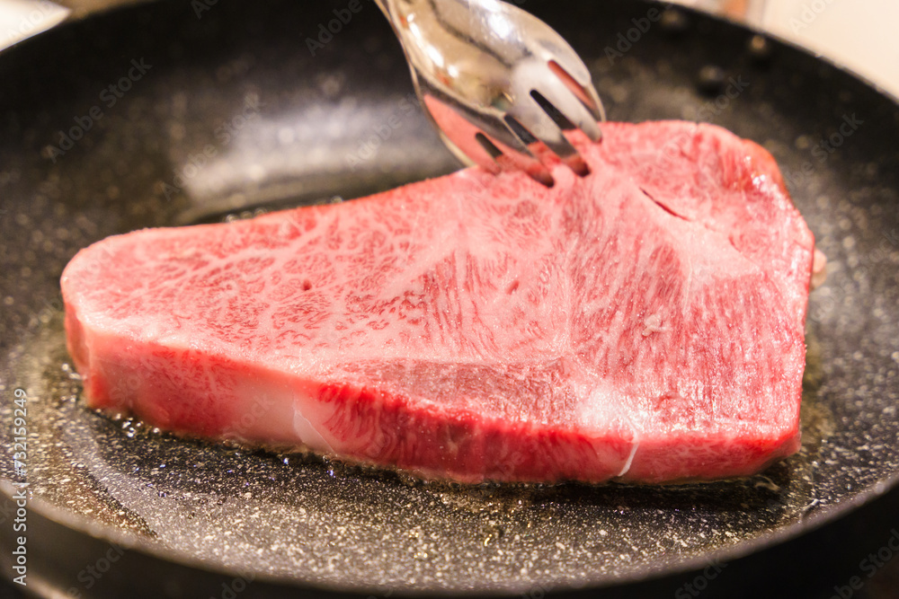 Papier peint 霜降りぎ牛ステーキをフライパンで焼く