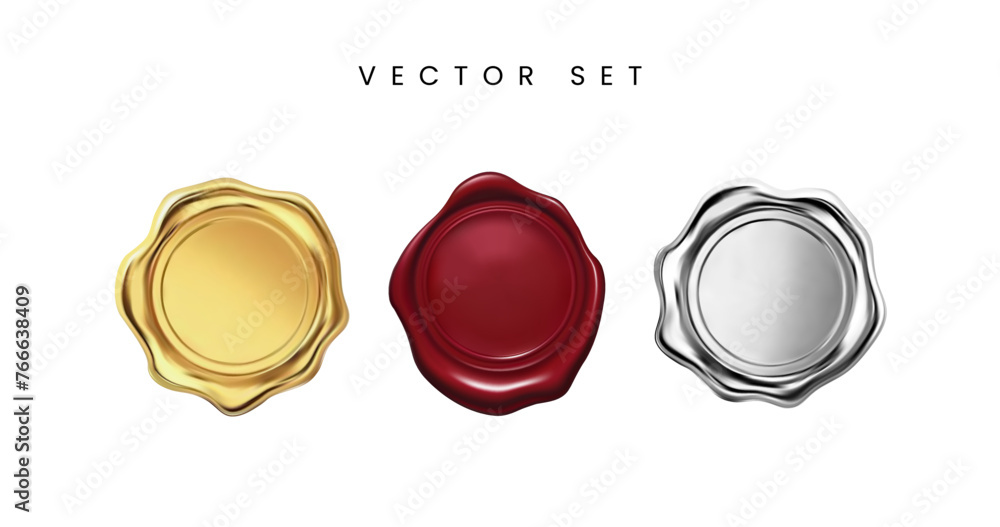 Papier peint Realistic vector seal wax set. Gold, red and silver wax seal set.