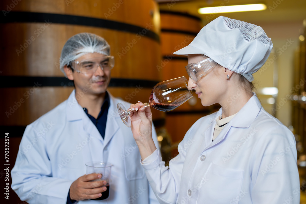 Papier peint In a winery's aging room, a focused female wine expert evaluates the aroma of a wine sample while a male colleague observes