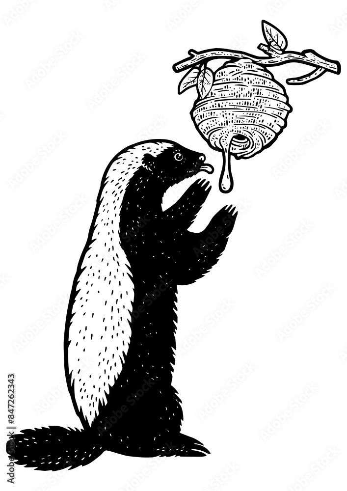Papier peint Honey badger ratel eats honey from wild bees hive animal sketch engraving PNG illustration