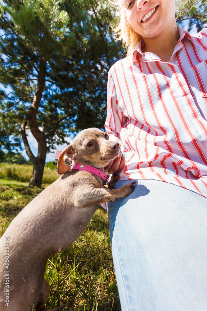 Papier peint Woman playing pinscher ratter dog outside