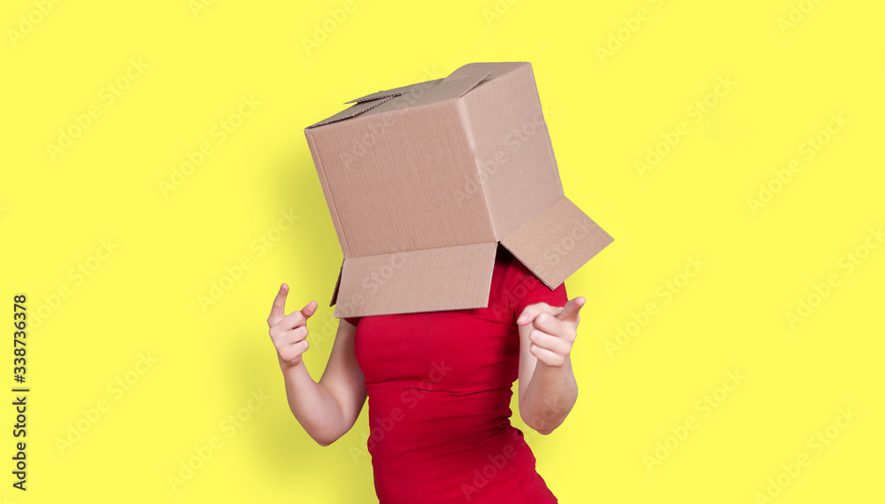 Photos Person with cardboard box on the head pointing to something with their index fin
