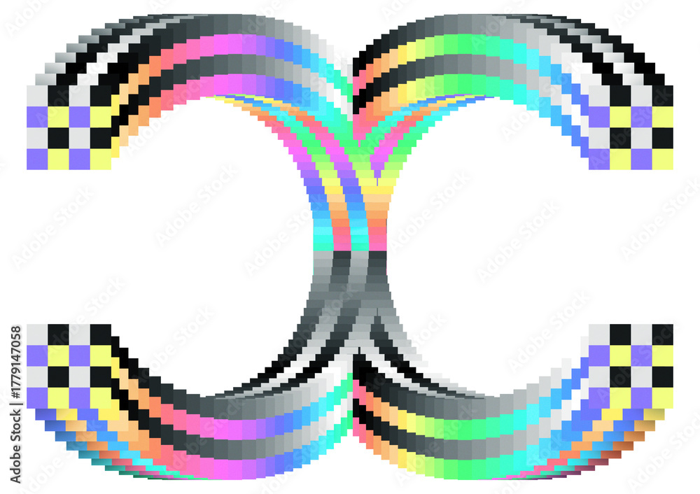 Photos Pixel art illustration with curved mirrored shapes featuring a colorful gradient and 3D depth, designed as an abstract geometric key visual for digital and graphic design