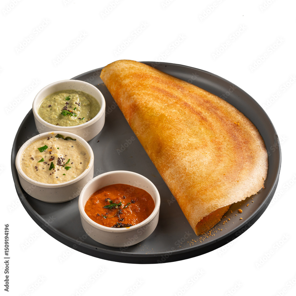 Photos Plate of masala Dosa with three types of chutneys on a Transparent PNG backgroun
