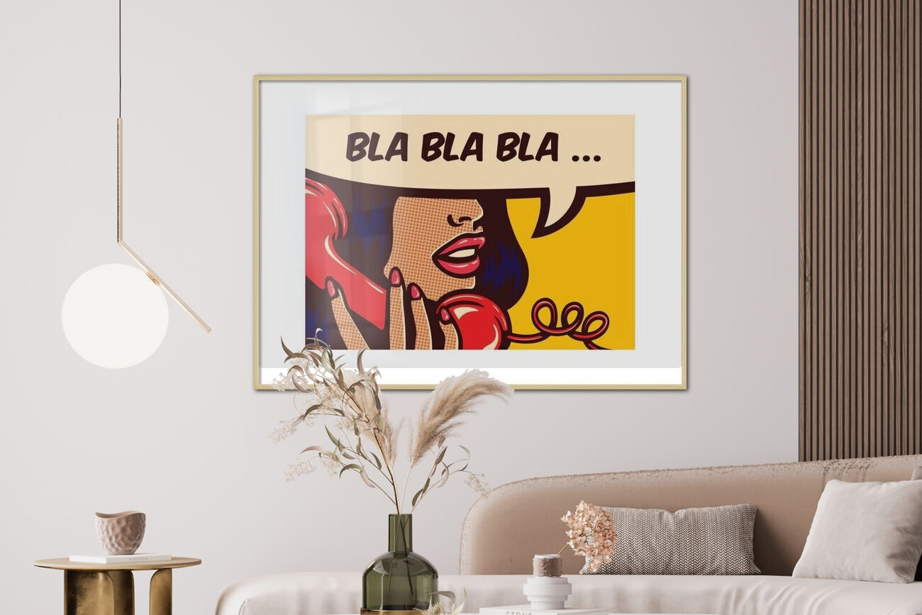Pop art style comic book panel with girl talking nonsense on vintage phone gossip chatter in speech bubble vector illustration