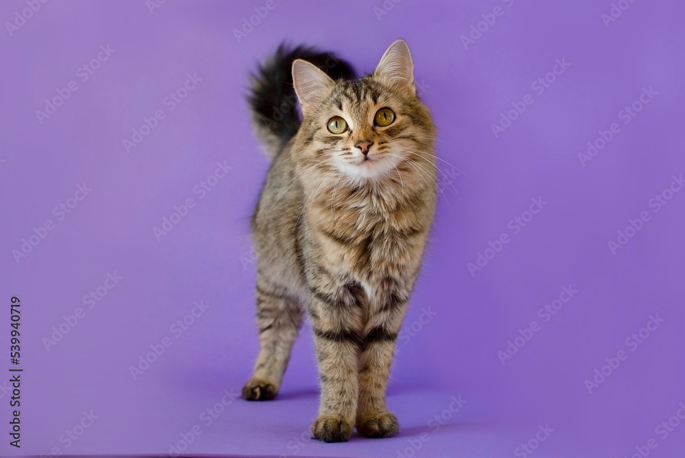 Photos Portrait of a charming gray tabby cat posing in the background in the studio