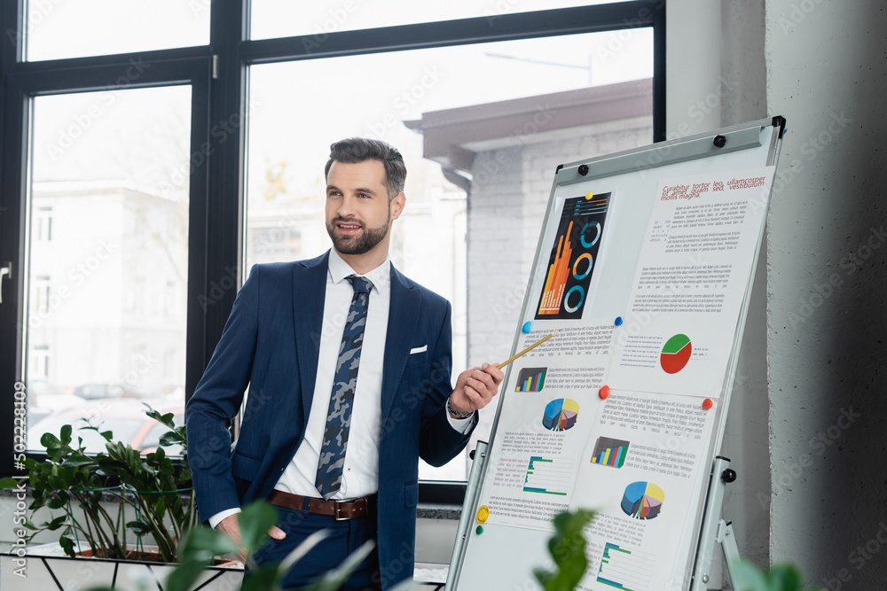 Photos positive economist pointing at analytics on flipchart and looking away in office
