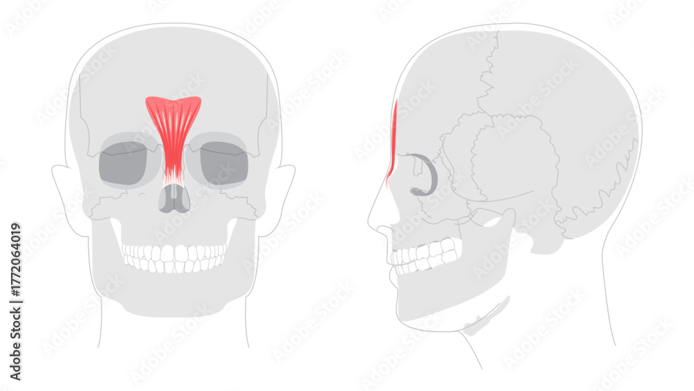 Photos Procerus - Nasal muscle shown in anatomy diagram, responsible for drawing the skin between the eyebrows downward, expressing frowning medical reference and educational illustration