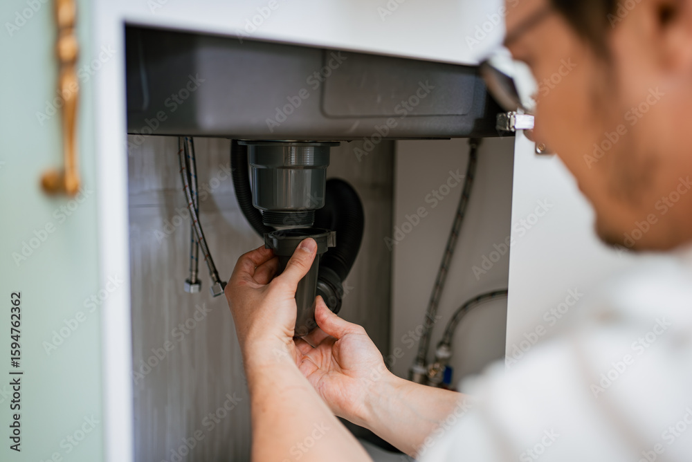 Tableau sur toile Professional plumber working diligently on installing a siphon beneath the kitch