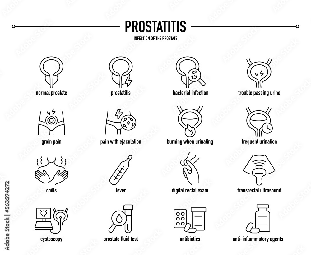 Photos Prostatitis symptoms, diagnostic and treatment vector icon set