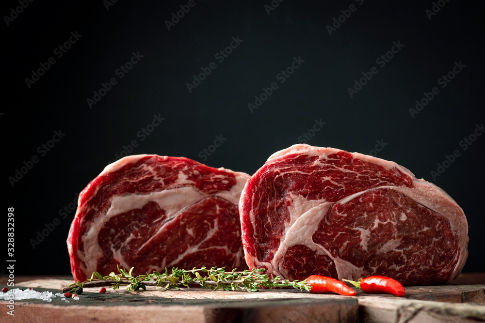 Tableau sur toile Raw rib eye beef steak with pepper and herbs on a wooden background in a butcher