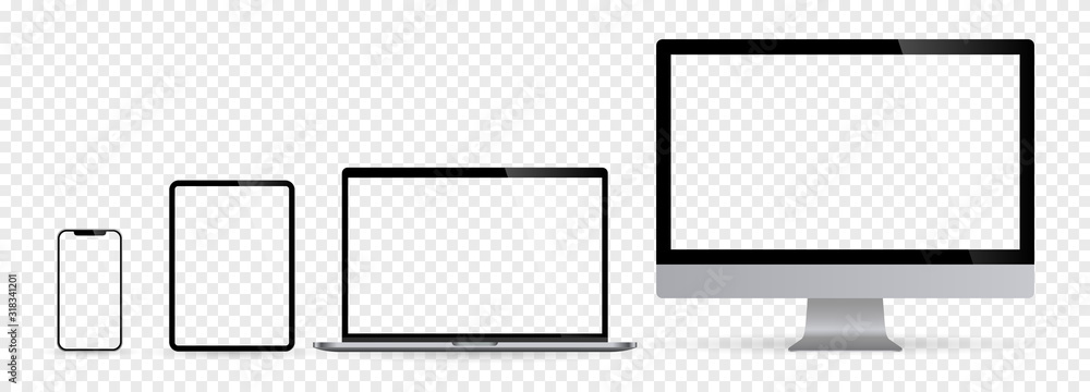 Photos Realistic set of computer monitors desktop laptop tablet and phone with checkerboard screen and background
