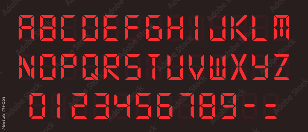 Photos Red Digital Display Font with Alarm Clock Letters, Electronic Alphabet, Retro Calculator Symbols, LCD Monitor Characters, and Scoreboard Digits