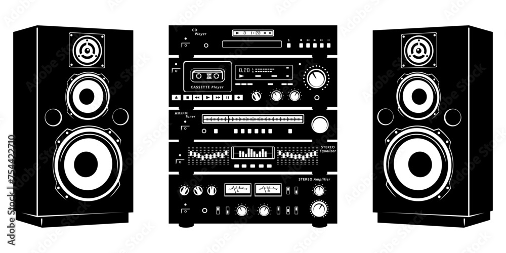 Photos Retro Audio System of CD player, audio cassette player, radio tuner, graphic equalizer, stereo amplifier and speakers