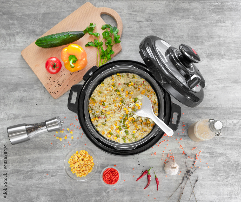 Photos rice with vegetables in a slow cooker top view
