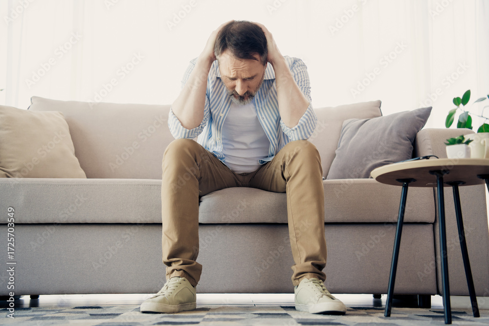 Photos Sad man sitting on a couch, showing stress and introspection, dressed casually i