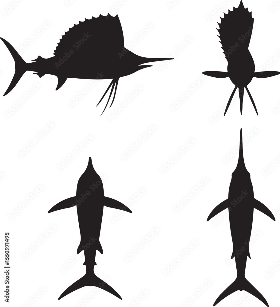 Tableau sur toile Sailfish silhouette of icons set side, front, back, and top views vector art ill