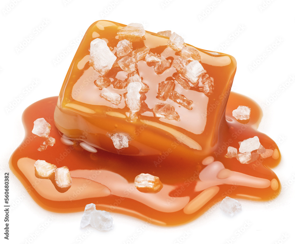 Tableau sur toile Salty caramel candy in milk caramel sauce with salt crystals isolated on white background