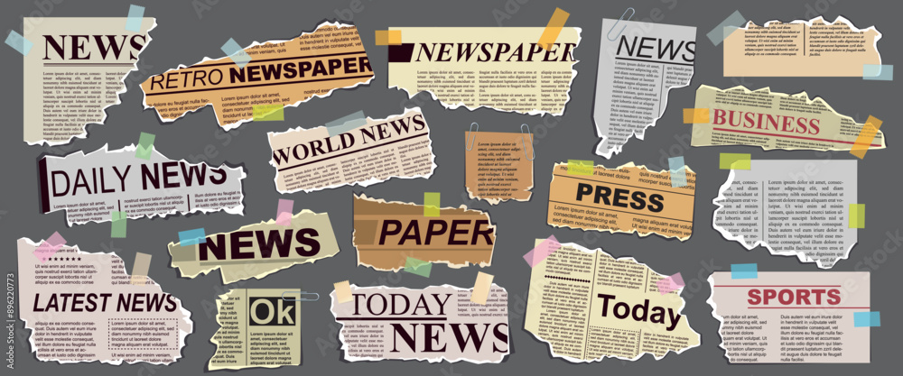 Tableau sur toile Scraps of old newspaper headlines taped to the board with tape and paper clips