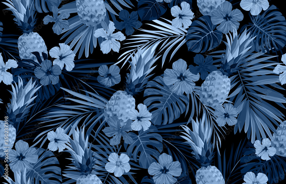Papier peint Seamless hand drawn tropical vector pattern with exotic palm leaves, hibiscus flowers, pineapples and various plants on dark background