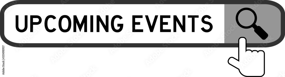 Photos Search banner in word upcoming event with hand over magnifier icon on white back