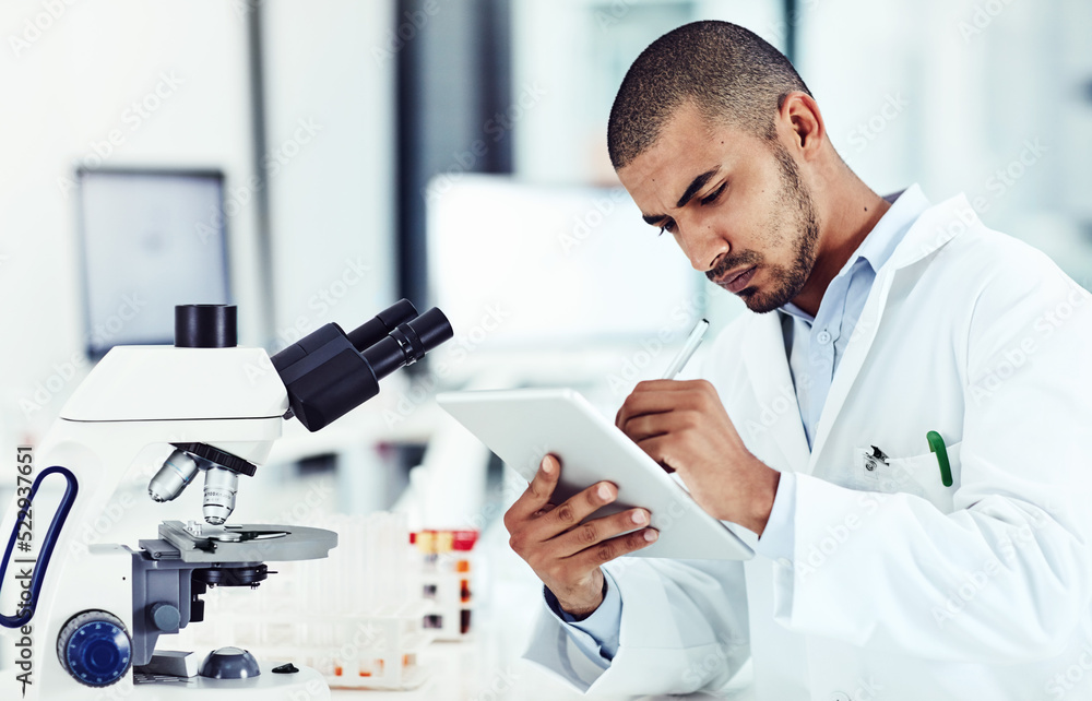 Photos Serious male scientist working on a tablet reviewing an online phd publication in a lab