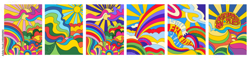 Tableau sur toile Set of 6 brightly colored psychedelic landscapes