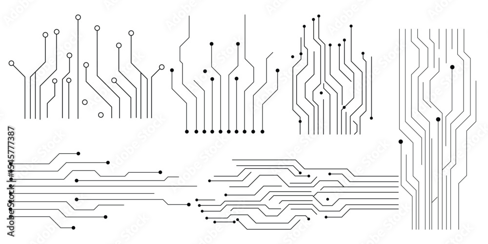 Photos Set of abstract black circuit lines and nodes on white background, ideal for tec