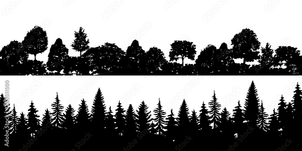 Tableau sur toile Set of black horizontal silhouettes coniferous treetops forest pine, spruce, cedar