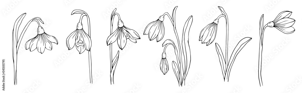 Photos Set of botanical linear sketches of snowdrop flowers and buds