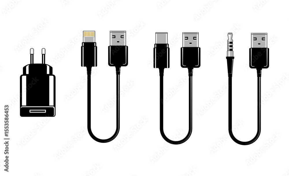 Photos Set of minimal icons with power adapter and various USB cables, including audio and compact connectors