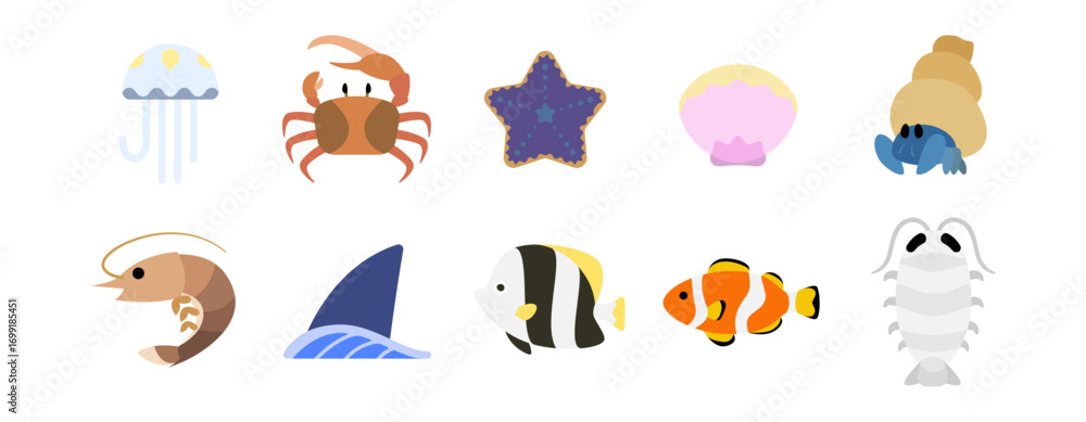 Photos Set of ten marine life icons featuring jellyfish, crab, starfish, shells, shrimp