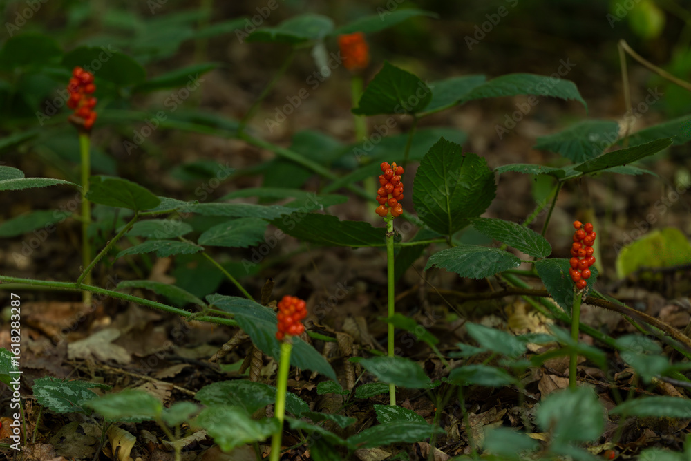 Photos Several cuckoopint or jack-in-the-pulpit (Arum maculatum) with ripe red berries