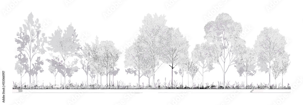 Photos Side view architectural tree drawing, forest line in minimal cad style, wetland section set for landscape plan, vector illustration, design elements, garden planning, nature layout