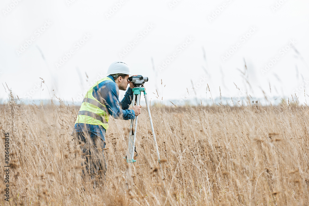 Tableau sur toile Side view of surveyor with digital level measuring field