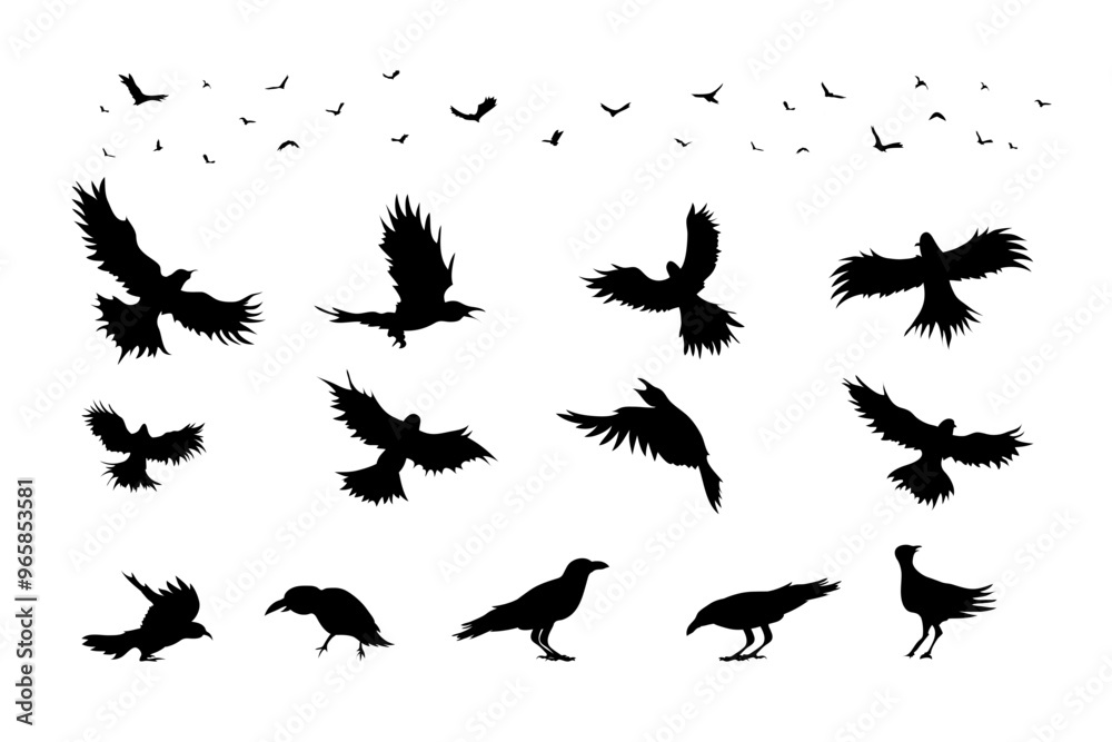 Photos Silhouette Crow black color in many action and spreads wings, flying, Gliding, standing, Swooping