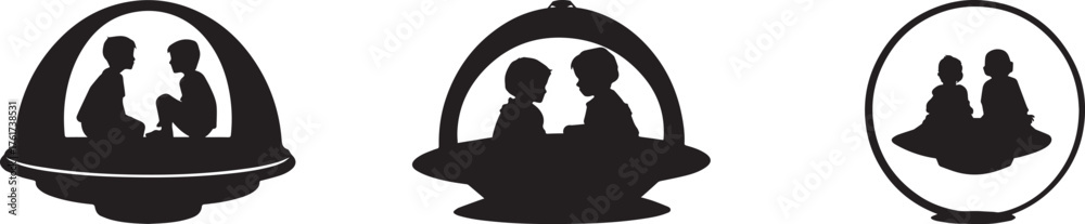 Photos Silhouette of two children sitting together inside a UFO spaceship, symbolizing