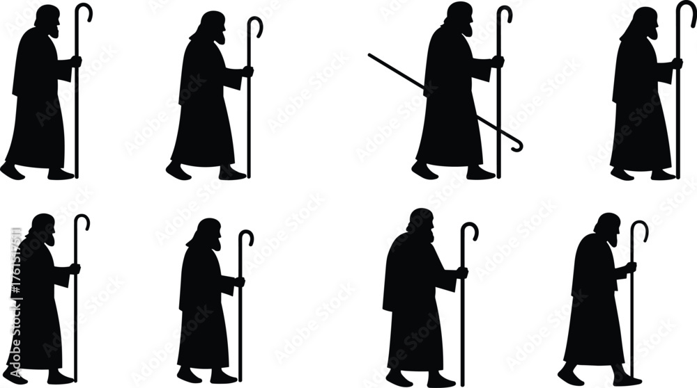Tableau sur toile Silhouettes of a biblical prophet or shepherd walking with a staff or crook, representing ancient history, religious figures, guidance, and historical journey on white