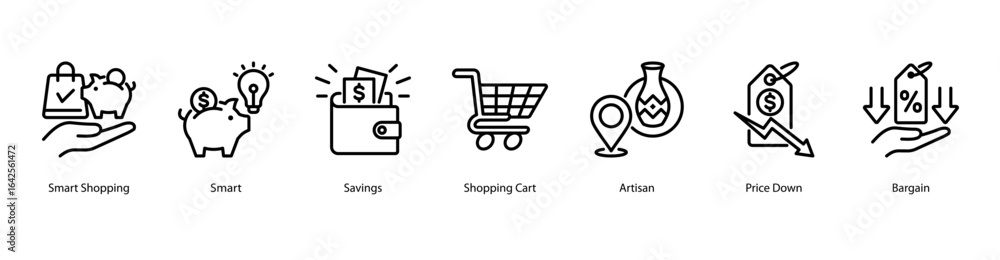 Photos Smart Spending Decisions web banner icon vector illustration featuring Smart Shopping, Smart, Savings, Shopping Cart, Artisan, Price Down, and Bargain